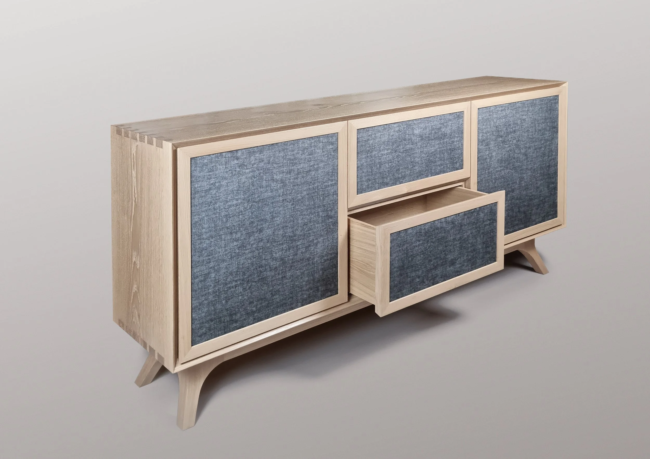 Das Sideboard wurde von mir nach Kundenbedürfnissen speziell für den Schlaf- und Wohnzimmerbereich entworfen und gefertigt. Das Möbel besteht abgesehen von den Fronten zu 100 % aus massivem Eichenholz. Bei den Fronten wurden die Füllungen mit einem samtigen Möbelstoff bezogen. Die grauen Füllungen sind aufgrund ihrer Konstruktion durch beliebige Materialien, Farben und Muster ersetzbar. Damit ist das Möbel nicht nur an aktuelle Bedürfnisse angepasst, sondern auch wandelbar.