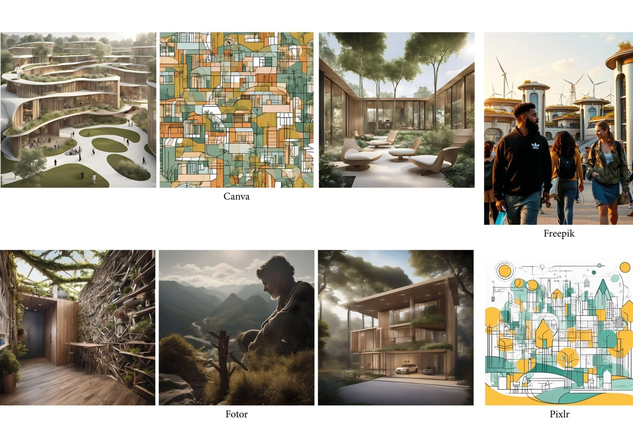 Für einen weiteren Versuch habe ich daher ein grafisches Thema ausgewählt, welches die Bedeutung von „SHOD“ widerspiegeln soll. Bei diesem Test achtete ich nicht auf die technische Korrektheit, sondern auf das Storytelling und die optische Qualität der Bilder. Die Eingabe von „sustainable human oriented design“ wurde dabei genauso wie beim Stuhl auf unterschiedliche Weisen interpretiert. Einige Modelle erzeugten architektonische Konzepte, deren Lebensräume der Eingabe entsprechen sollten, andere zeigen den Menschen in einer „heilen“ nachhaltigen Welt.
