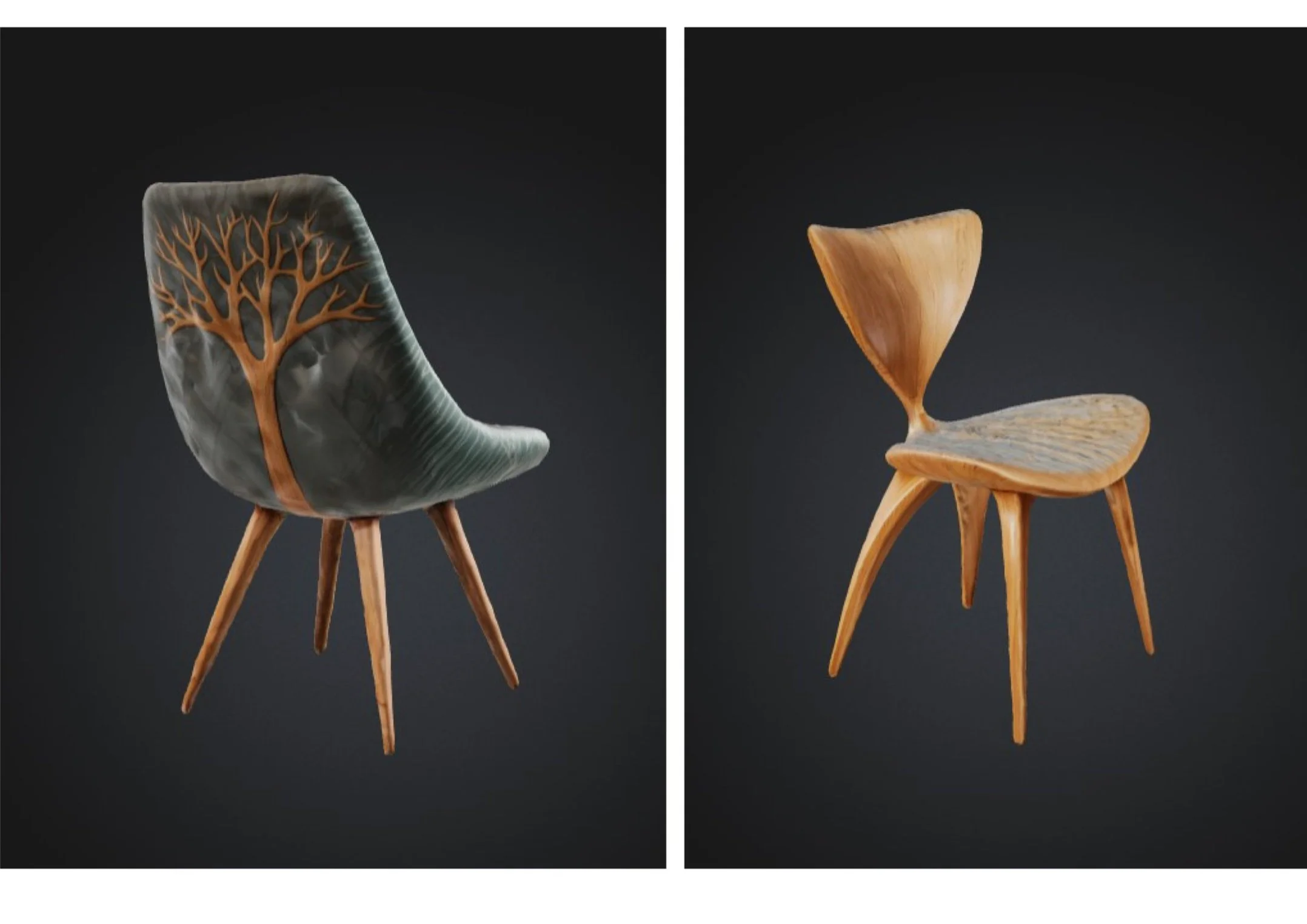 Begonnen habe ich mit Programmen, die aus Text 3D-Modelle generieren können. Meine erste Texteingabe „chair like a tree or bush“ führte zu sehr abstrakten Gebilden, die mehr einem Pilz als einem Baum ähnlich sahen. Mein Ziel war es, ein Stuhldesign zu erzeugen, welches auf der organischen Formensprache von Bäumen (Baumkronen und Ästen) beruht. Dazu haben präzisere Eingaben wie „modern design chair with impressions of a tree” (Abbildung Meshy links) oder „modern chair with the appearance of a tree” (Abbildung Meshy rechts) zu besseren Ergebnissen geführt. Bei weiteren Details wie „forms like tree branches“ war die KI aber überfordert und spuckte undefinierte Entwürfe aus. Diese Stühle hatten zum Beispiel nur zwei Beine. Generell können KI-generierte 3D-Modelle noch nicht als fertige 3D-Zeichnungen genutzt werden. Die Konstruktionen schauen auf den ersten Blick nicht schlecht aus, weisen aber bei genauerer Betrachtung erhebliche Fehler auf. Typische Fehler sind wellige Oberflächen, Löcher, Symmetrielosigkeit, Ungleichheit sowie offene Oberflächen und gefüllte Hohlräume. Für ein professionelles Design wäre daher eine Nachkonstruktion bzw. ein Neuaufbau der 3D-Zeichnung notwendig. Gut vorstellen könnte ich mir die Nutzung solcher 3D-Modelle in Gestaltungsbereichen der Architektur. Für Renderings werden dort oft 3D-Gegenstände benötigt, die teilweise keine große Detailgenauigkeit aufweisen müssen. Solche 3D-Modelle könnten individuell mit KI-Tools wie Meshy gestaltet werden und anschließend zum Designsetting hinzugefügt werden.