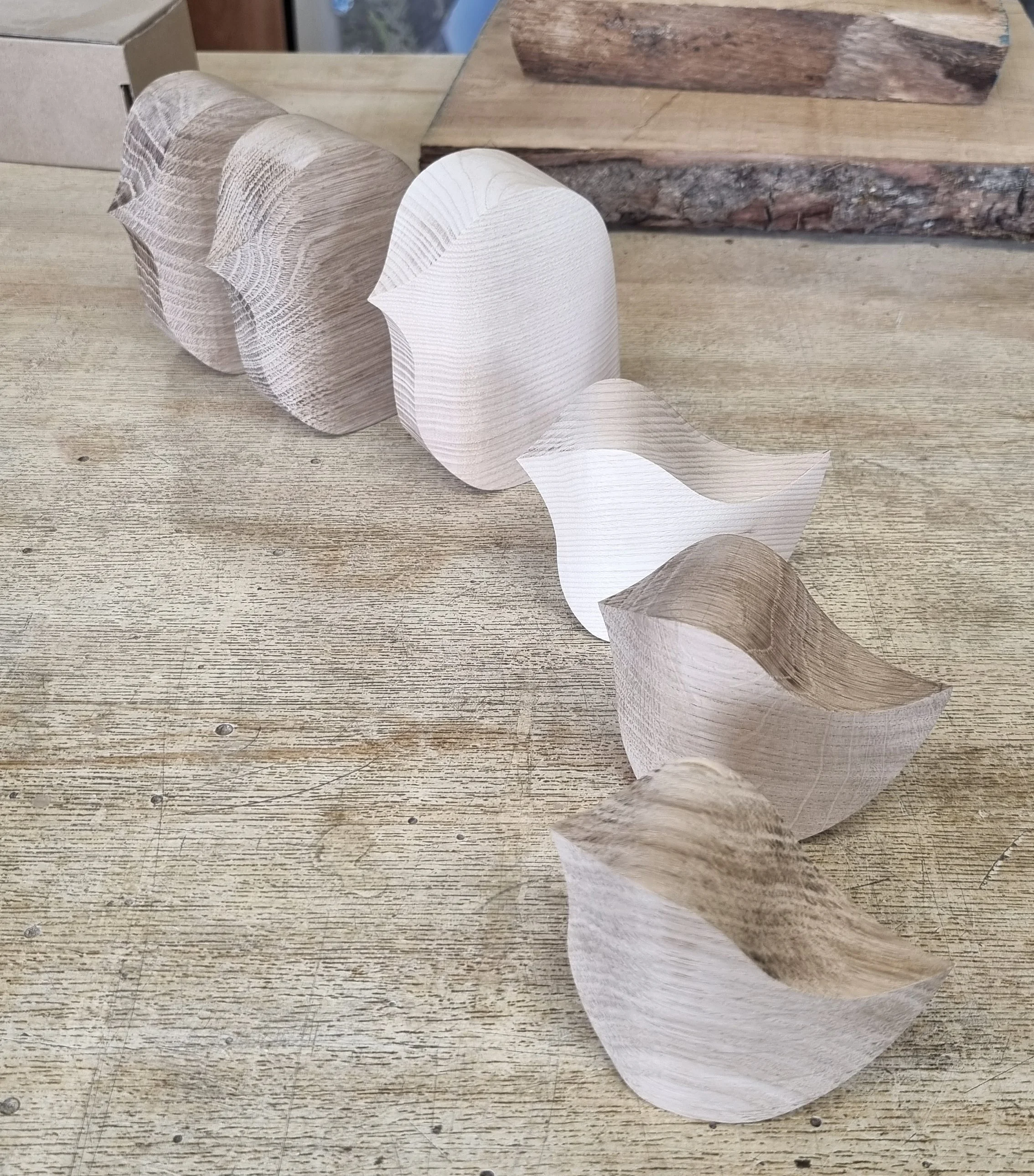 Nach dem Anzeichnen wurden die Vögel mit der Bandsäge ausgeschnitten. Nach dem groben Ausschnitt wurden die ersten Kanten geschliffen. Anschließend wurde der Vorgang mit anderer Ausrichtung wiederholt.Nach dem Grobschliff