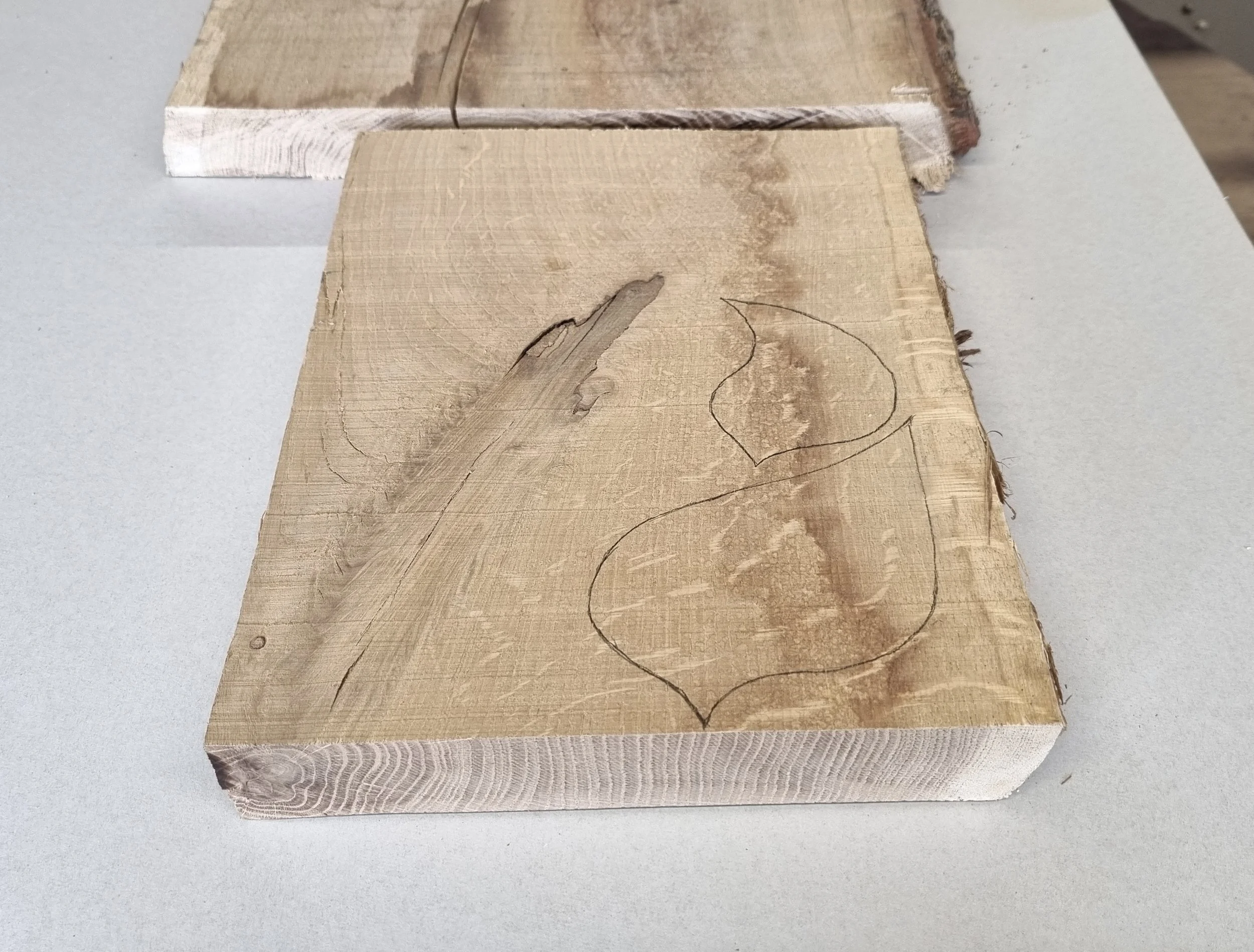 Die Abbildung oben zeigt typische Massivholzabfälle, wie sie beim Zuschnitt von Massivholz anfallen. Bei diesem Abfall musste aufgrund eines Holzfehlers (Flügelast) das Brett in diesem Bereich abgeschnitten werden. Daneben befand sich aber Holz mit guter Qualität, das ideal zur Herstellung genutzt werden konnte (Zeichnung Vögel).Zuschnitt mit der Bandsäge