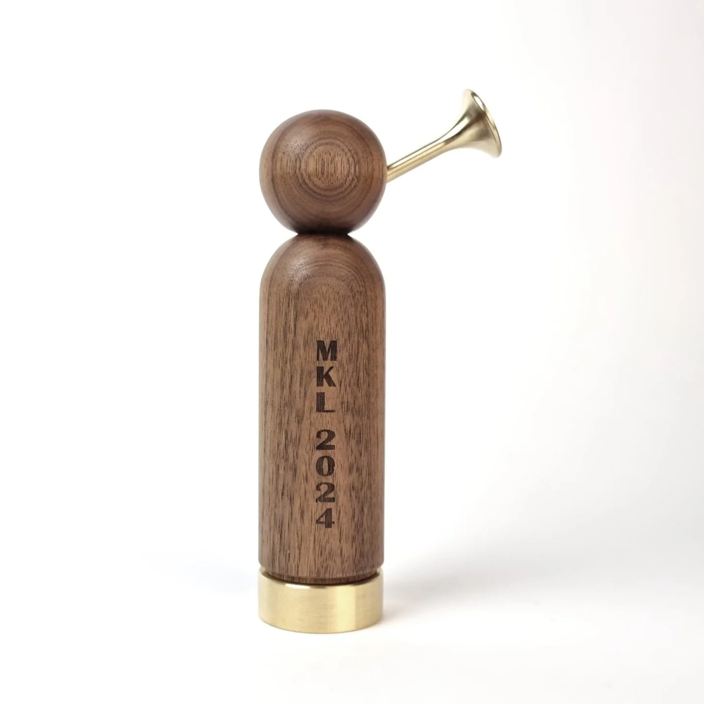Die Trophäen wurden entworfen für die besten beziehungsweise fleißigsten Kapellenmitglieder im Musikjahr 2024. Dafür sollte der Charakter des Entwurfs neben dem allgemeinen Bezug zur Musik, Erhabenheit und Aufstreben ausstrahlen. Gelungen ist das mit der Symbolik einer spielenden Person. Entscheidend ist dabei die nach oben ausgerichtete Spielposition. Das aufstrebende, in den Himmel gerichtete Horn übersteigt damit das Gewöhnliche. Ebenso war mir eine hohe Wertigkeit der Trophäen wichtig. Dafür wurde mit Massivholz und Messing gearbeitet. Die abstrakte Körperform wurde aus Nussholz gedrechselt. Das Messingmaterial gibt der Trophäe mehr Gewicht und zusätzliche Wertigkeit durch die glänzende Oberfläche. Der Sockel besteht neben dem Spielhorn auch aus Messing und gibt der Trophäe die nötige Balance und Standfestigkeit.